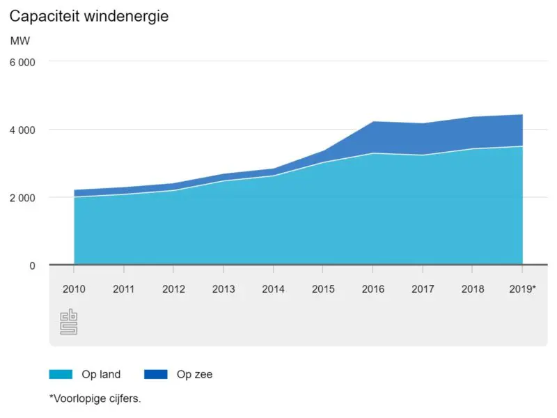 De stroomproductie uit windenergie steeg met 7 procent, van 10 miljard kWh naar 10,7 kWh. Net als in 2018 nam ook het afgelopen jaar het aantal windmolens nauwelijks toe. In totaal kwam er 70 megawatt aan vermogen bij. Het gaat in totaal om 3.500 megawatt. Op zee kwamen er geen molens bij en zo bleef de capaciteit daar op bijna 1.000 megawatt.