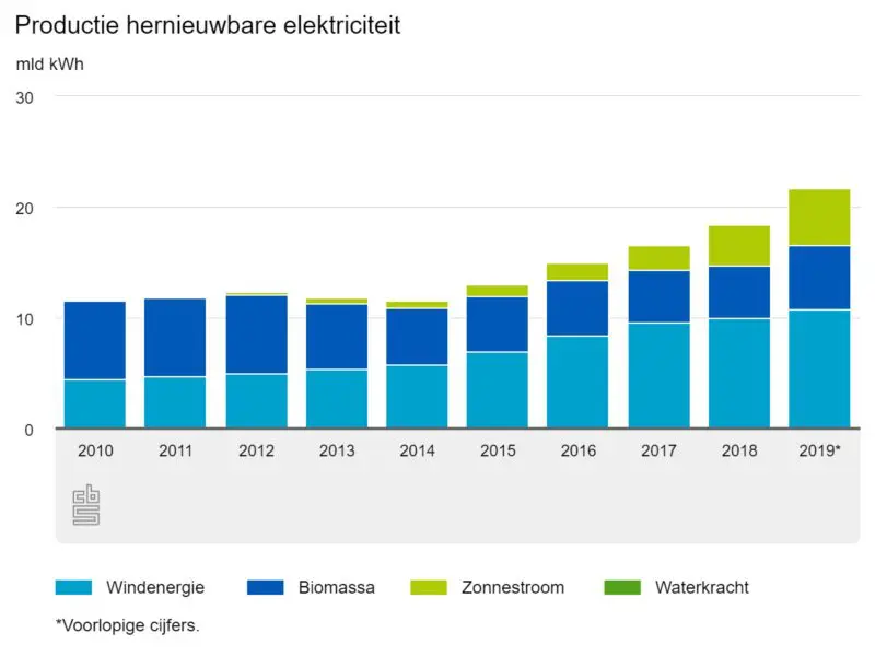 Vorig jaar werd er 21,8 miljard kilowattuur (kWh) aan elektriciteit uit hernieuwbare bronnen opgewekt. In 2018 was dit nog 18,5 miljard kWh. Het aandeel windenergie is hierin nog steeds het grootst (49 procent), maar daalde wel. In 2018 was dit nog 54 procent. Het afgelopen jaar was biomassa goed voor 26 procent, pv-panelen zorgden voor 24 procent van hernieuwbare energie.