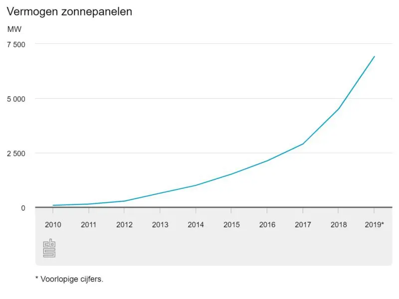 Met name de hoeveelheid zonnestroom nam toe, met 40 procent, van 3,7 miljard kWh in 2018 naar 5,2 miljard kWh in 2019. Dit heeft vooral te maken met de toename van het aantal opgestelde zonnepanelen. Het totale vermogen van zonnepanelen groeide in het afgelopen jaar met ongeveer 2.400 megawatt. De totale capaciteit wordt geschat op ongeveer 6.900 megawatt. 70 procent van de groei is toe te schrijven aan nieuwe, grote installaties op daken van gebouwen en op de grond.
