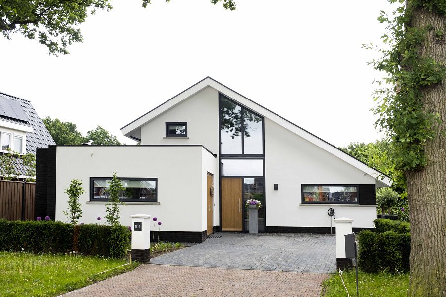 De Ampèrevilla, en woning, van Koos Folmer van Eplucon in Nunspeet. De woning is van de buitenzijde geïsoleerd. Die isolatielaag is vervolgens gestuukt.