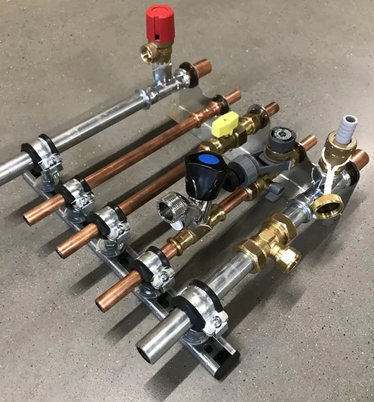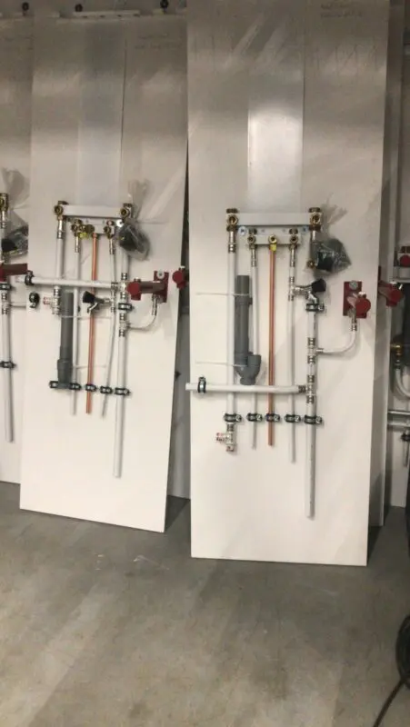 Ketelborden met voorgemonteerde aansluitingen voor de cv-ketel, die op het laatste moment kan worden geplaatst. Nu worden cv-ketels niet veel meer geplaatst in nieuwbouw, maar het voorbereiden van de aansluiting kan nog steeds. Dit kan bijvoorbeeld met prefab aansluitsetjes, met de appendages en leidingen eraan. Superstrak en hoogwaardig. Let wel: de aansluitingen kunnen per ketelmerk verschillen. Het ketelbord is van Van Hoften, de aansluitset van Rensa.