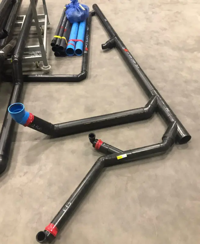 PE afvoersets, hier in de hal bij Van Hoften: de juiste aansluitingen, bochten en afschot voorgemonteerd. Minder handelingen op de bouwplaats, geconditioneerde omstandigheden van montage, en minder afval. Ook fabrikanten van afvoermaterialen bieden prefab-services.