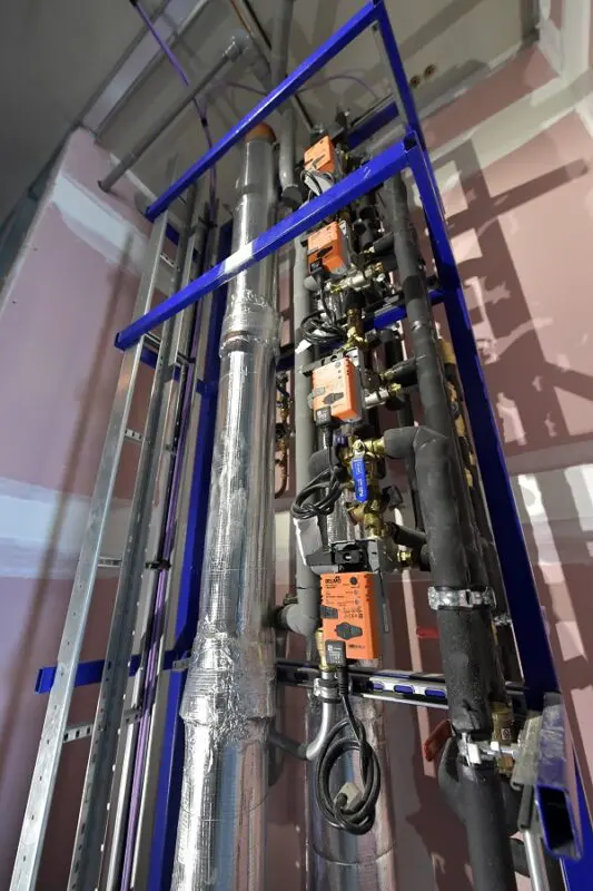 Ideaal voor gestapelde bouw, maar denk ook aan hotels: prefab schachten die per verdieping gestapeld kunnen worden. Voorgemonteerd onder fabriekscondities. Standleiding, ventilatie, cv-leidingen, netjes gebeugeld aan rails. Het voorkomt dat legio partijen op de vierkante meter hun kunstje moeten doen.
