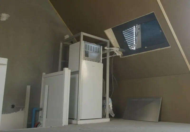De buitenunit van de lucht/water-warmtepomp kan op het dak worden geplaatst, en via een luik aan de binnenzijde gewoon bereikbaar zijn voor onderhoud. Ook deze dakunits worden volop geprefabriceerd, en inclusief buitendeel op het dak gehesen, inclusief aansluiting voor ventilatie afvoer en rioolontspanning.