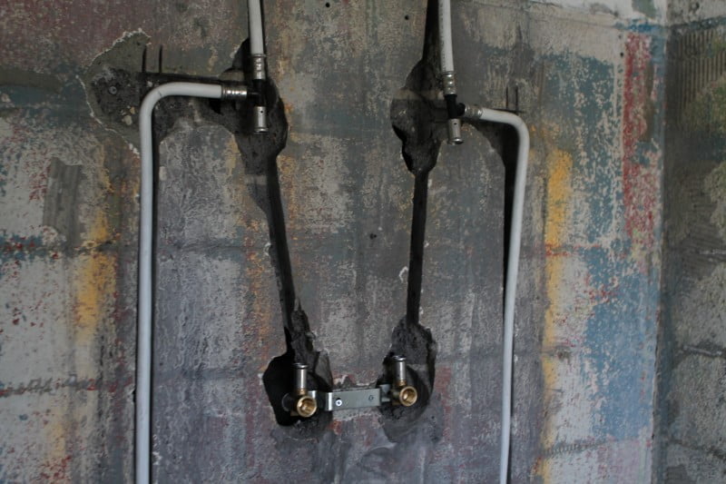 In de keuken eenzelfde uitdaging. De wand is van dermate matige kwaliteit dat sloop en nieuw leidingwerk wel eens tot vervelend meerwerk zou kunnen leiden. Daarom is na de proefstrang overal gekozen voor een constructief zelfstandige metal-stud voorzetwand, die weliswaar een paar centimeter van het keukentje afsnoept, maar ruim baan biedt voor leidingwerk, en geen zorgen over plaatsing van de keuken en Intergas HR 107-ketel (in kastje) oplevert. De rookgasafvoer (kunststof) gaat via de toiletschacht naar het dak. Luchttoevoer komt vanuit de loggia naast de keuken.