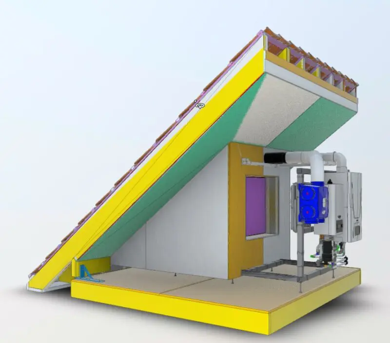 Een nieuwe oplossing om het buitendeel van een (hybride) warmtepomp in het dak te hebben, maar het wel van binnenuit servicebaar te houden. Preworxs komt dit jaar met een nieuwe Indak Skid voor hybride warmtepompen, die binnen enkele uren een complete geprefabriceerde installatie een zolder op kan schuiven.