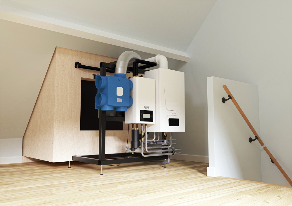 Op het stalen gepoedercoate frame zijn cv-ketel, binnendeel van de warmtepomp en de mechanische ventilatie gemonteerd. De skid is tevens voorbereid voor een PV omvormer De rookgasafvoer mondt in het bovenste deel van het rooster. De afvoer van de ventilatie mondt achter de aanzuig van de buitenunit, zodat ook de ventilatielucht nog over de warmtepomp wordt gevoerd.