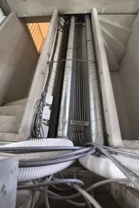 Een in het oog springend element voor de installaties is de betonnen trap. Hierin is een verticale leidingschacht verwerkt. De kabelbomen en ventilatiebuizen zijn op een frame gemonteerd en worden ter plaatse in de schacht geschoven. De installateur koppelt de leidingen vervolgens aan de installaties. Op zolder staat de installatiekast. In de kast zitten het boilervat van 200 liter, de Growattomvormer voor de PV-panelen, het drukvat, de verdelers voor de vloerverwarming en de ventilatie-WTW die door CO2-sensoren in de woning wordt aangestuurd. “Eigenlijk het kloppend hart van de woning met de hoofdcomponenten, balansventilatie, omvormer en WTW die daar aan elkaar zijn gekoppeld. De verschillende puzzelstukjes worden op deze plek in elkaar geschoven.” Er is een directie verbinding met de schoorsteen die als buitenunit van de luchtwaterpomp geldt. Op deze locatie zorgt die voor de minste overlast.