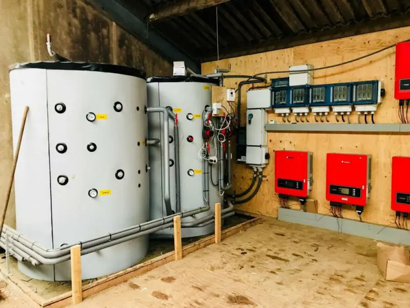 De warmte die het gasvormige koudemiddel in de platenwisselaar overdraagt aan het systeemwater wordt vervolgens opgeslagen in goedgeïsoleerde buffertank. Daarmee kan spoelwater worden voorverwarmd, maar steeds vaker wordt de boerderij ermee verwarmd. Soms zelfs het gehele jaar, in andere situaties blijft de cv-ketel paraat voor koude dagen. Hoeveel warmte beschikbaar is, is afhankelijk van de grootte van het boerenbedrijf. “Een boerderij met zo’n 100 koeien produceert jaarlijks zo’n 1 miljoen liter melk. Dat levert gemiddeld ruim 5000 m3 aan aardgasbesparing op.” Bij grotere boerderij kan soms zelfs de gasaansluiting verdwijnen, vertelt Christenhusz: “Er zijn situaties met 2 miljoen liter melk waarbij we een bedrijf helemaal gasloos kunnen stellen. Dat huis had al overal vloerverwarming.” Het maakt niet uit of de boer een melkrobot heeft of nog traditioneel twee keer per dag melkt. De warmterugwinning is altijd toepasbaar. Bij de melkrobot is er een constantere toevoer van warme melk en ontstaan er geen echte pieken. De buffervaten hoeven minder groot te zijn. In het voorbeeld met 100 koeien en 1 miljoen liter melk is bij twee melkmomenten een buffer nodig van. 3.000 liter. Bij gebruik van een melkrobot is de buffer zo’n 500 tot 800 liter groot.