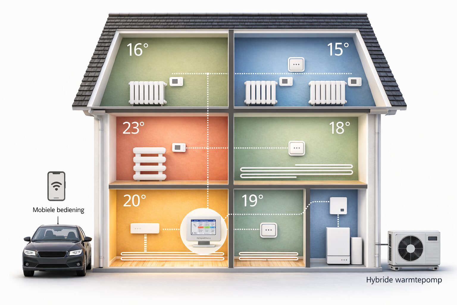 Misschien zul je na het oplossen van al deze vragen merken dat een toenemend aantal consumenten de ruimtes in hun woning ook onafhankelijk van elkaar wil kunnen regelen. Een zoneregeling is dan onmisbaar. De fabrikant van de warmtepomp denkt ongetwijfeld na over de aansturing van zijn toestel, maar dat beperkt zich vrijwel altijd tot het toestel in de technische ruimte. Hoe de temperatuur in de leefruimte op een comfortabel niveau komt en blijft – laat staan in de verschillende zones of ruimtes van een woning – is meestal niet de functie van de regeling die bij het toestel hoort.