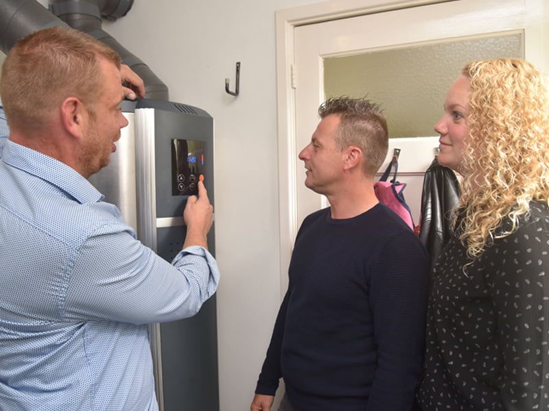 Hier overwogen, omdat het een HSB-huis is, om een WTW te laten installeren. Na veel wikken en wegen gekozen voor systeem C. De woning is al voorzien van ZR-roosters en in de koude beginperiode (februari zijn we erin getrokken) bleek dat de tocht aanzienlijk minder is dan in onze oude woning met ouderwetse roosters. De MV-installatie werkt CO2-gestuurd en de hele installatie hebben we uiteraard ingeregeld.