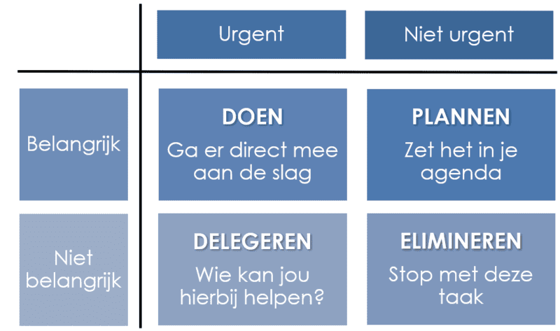 Dan heb je nog de werkzaamheden die niet urgent zijn. Maar ook niet belangrijk! Die moet je elimineren. Door er onmiddellijk mee te stoppen! Dat zijn de mailtjes die onderin je mailbox zitten. Je kent ze vast wel. Of de geeltjes die op je werkplek hangen. Met daarop zaken die je nog eens moet gaan doen. Maar die niet urgent zijn. Stop daarmee. Gooi ze weg en delete ze uit je mailbox. Want je gaat er toch nooit wat mee doen. Laat je er dan ook niet door afleiden. Het zorgt alleen maar voor een vol hoofd.