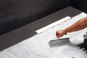 Juist is: Tegellijm verhardt zich door cementering. Deze chemische reactie doet zich ook voor waar er geen lucht bij kan. Als het werkelijk nodig zou zijn, openingen voor het lekwater aan te brengen voor het ventileren van de mortellaag, zouden tegels van groot formaat alleen nog direct langs de douchegoten mogen worden gelegd.