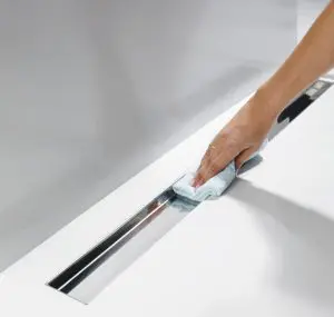 Juist is: Voegloze en gesloten douchegoten van roestvast staal zoals TECE ze levert, zijn gemakkelijk schoon te houden. Er zitten geen hoeken in of holle ruimten die onbereikbaar zijn en ze hebben geen schroeven of schroefdraad waar vuil of haren aan kunnen vast blijven haken.