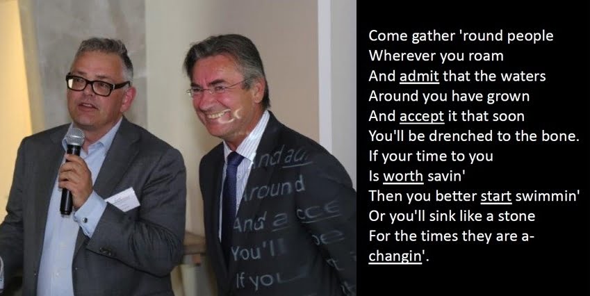 Als derde spreker in een line-up van 5 voelde ik dat er wat extra energie in de groep moest komen. De zaal bestond namelijk uit directeuren en de hebben de eigenschap dat ze liever zelf praten dan naar anderen luisteren. De laatste spreker was de voorzitter van Bouwend Nederland, Maxime Verhagen. Ik had een slide voorbereid met een liedtekst van Bob Dylan, die gaat over de essentie van veranderen.