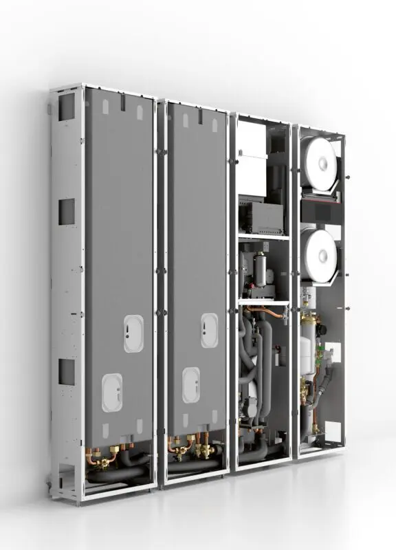 Alle installatietechniek in een wandkast: warmtepomp, tapwatervaten, appendages en ventilatie in een modulair kastensysteem van 28 cm diep. Viessmann liet op de ISH Invisible zien: een ruimtebesparend concept.