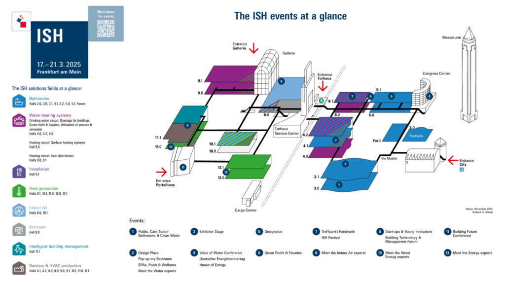 Niettemin predikt de ISH vooral duurzaamheid. Onder het motto ‘Oplossingen voor een duurzame toekomst’ zal ISH 2025 zich richten op Europese doelen qua duurzaamheid en CO2-reductie. De beurs, die uit zo’n 20 hallen bestaat, richt zich op acht oplossinggebieden: badkameroplossingen (sanitair), watervoerende systemen, installatietechniek (gereedschappen en praktische techniek), warmteopwekking (onder andere de warmtepompen), binnenlucht (vooral ventilatie), software, componentenleveranciers (vooral toeleverende industrie) en gebouwautomatisering (energiemanagment). De beurs heeft een uitgebreid inhoudelijk programma met kennissessies en congressen. Dat inhoudelijke deel zal zich vooral richten op de Duitse markt, al geeft het internationale perspectief ook veel inzichten voor de Nederlandse installatiebranche.