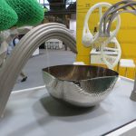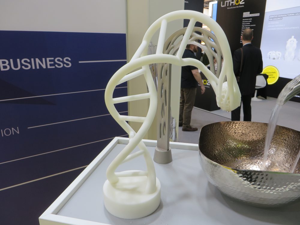 De kraan van de toekomst heeft een speelse, maar wel opvallende complexe vorm. Fit Prototyping toonde een aantal kranen die zijn gemaakt door middel van additive manufacturing (ook wel 3D-printing genoemd). Bijzonder is dat deze innovatieve productietechnologie het mogelijk maakt om de waterkanalen binnen in de kraan dubbelgekromd (in het 3D-vlak) uit te voeren. Deze kanalen zijn als het ware contourvolgend. Of, zoals bij een aantal van deze kranen, volgt de buitenomtrek van de kraan exact de loop van het waterkanaal. Bij additive manufacturing groeit een metalen deel door met een laser laagje voor laagje metaalpoeders aan elkaar te smelten. In vergelijking met gieten is het een langzaam proces, maar de vormvrijheid is verrassend.