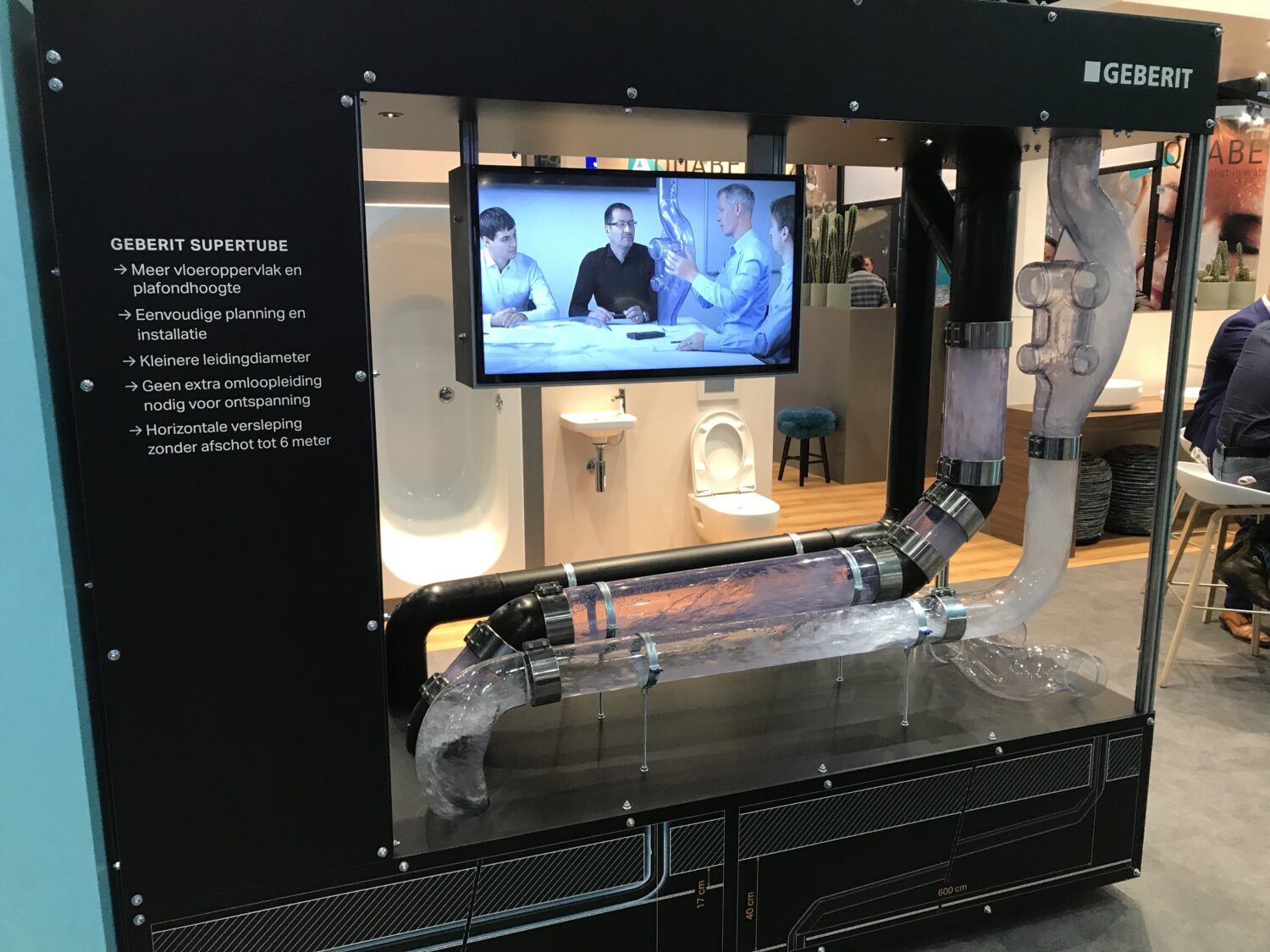 De kunst van het SuperTube-systeem, dat Geberit op de BouwBeurs introduceerde, bestaat uit drie speciale, gepatenteerde fittingen. Deze zorgen bij verdiepingsaansluitingen en bij de richtingverandering in de standleiding voor een continue luchtkolom in de afvoerleiding.