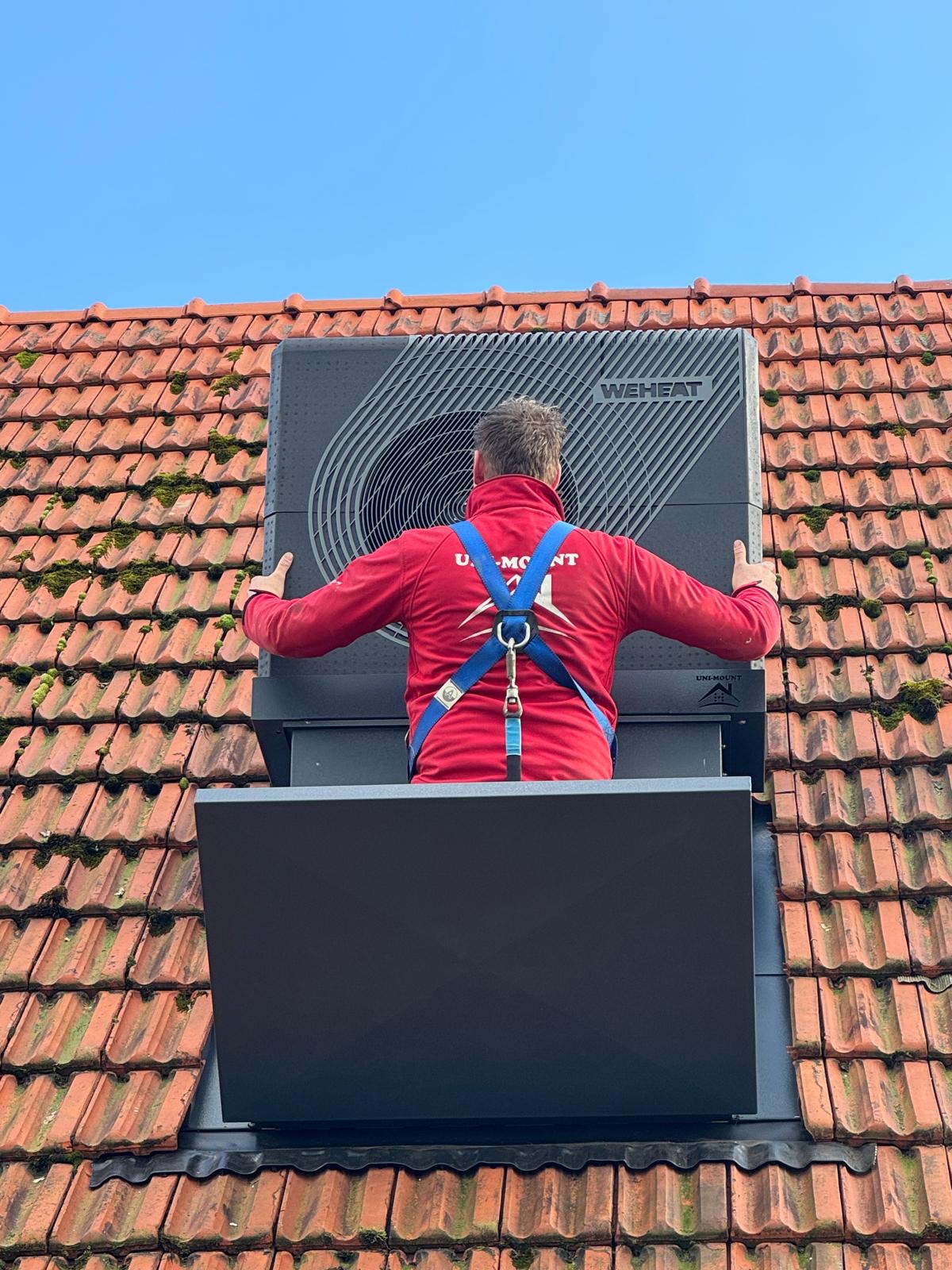 De variatie aan warmtepomptypes zorgt er ook voor dat er nieuwe dakopstellingen komen. Unimount heeft haar concept met serviceluiken ook losgelaten op de nieuwe warmtepompen van onder andere Bosch en Weheat.