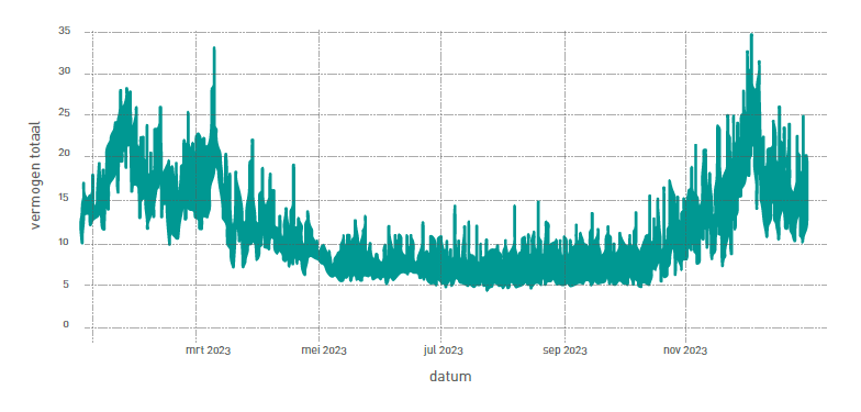 Theoretisch zouden deze 75 warmtepompen dus een gelijktijdige piek kunnen laten zien van ruim 180 kW. Maar die pieken blijken in het meetjaar 2023 nooit gehaald te worden. Sterker nog: de hoogste piek komt niet voorbij de 35 kW. Deel je dat door het aantal warmtepompen, dan krijg je een ‘gelijktijdigheid’ per warmtepomp van slechts 0,5 kW (zie grafiek), voor verwarming en warmtapwater.
