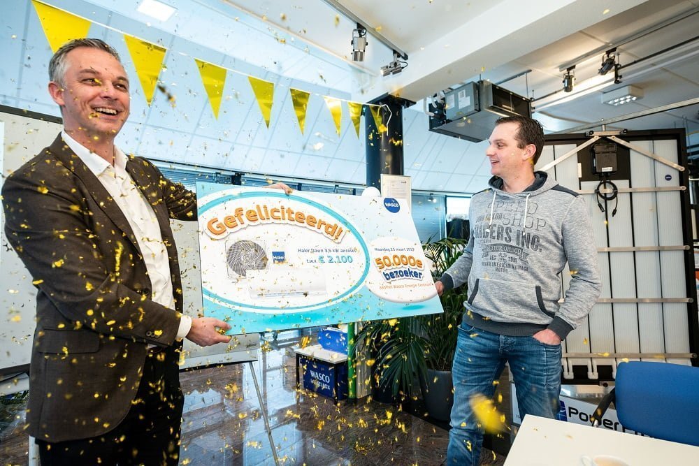 Een verrassing voor Paul Boerboom, de monteur van Boerboom Loodgietersbedrijf. Hij was de 50.000e bezoeker van het Wasco Energie Centrum, het opleidingscentrum van de technische groothandel in Twello.