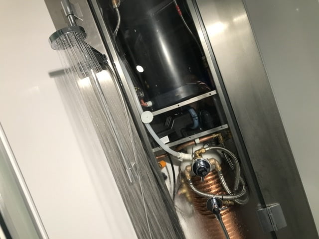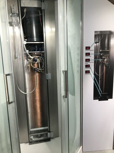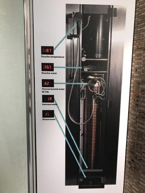 Alleen nog maar een koudwater-aansluiting in de badkamer, en tóch warm douchen. Het nieuwe bedrijf MEED combineert een close-in-boiler met een douche-wtw. 80% warmteterugwinning met een klein beetje elektrische hulp.