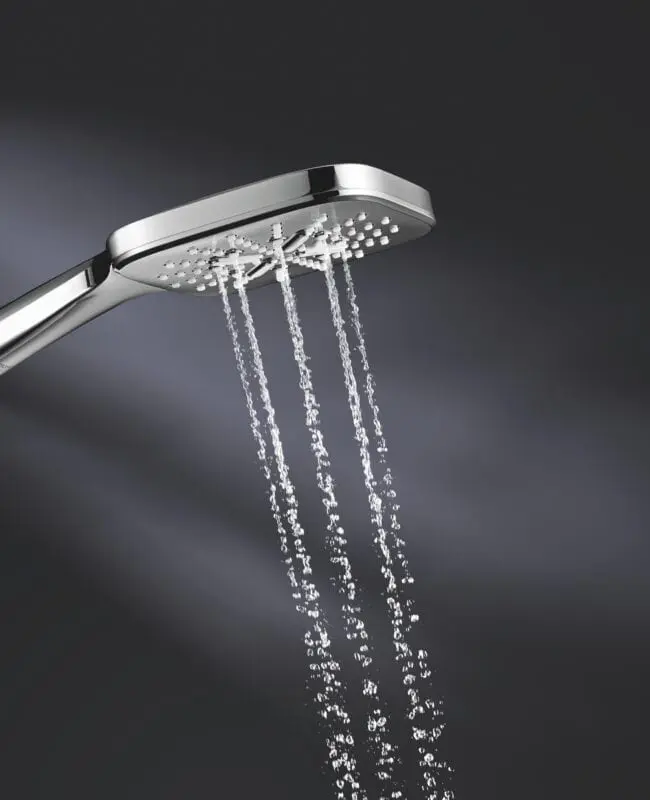 Grohe introduceert een handdouche met drukknop. De gebruiker kan van douchestraal wisselen door op het mechanische drukknopje te drukken.