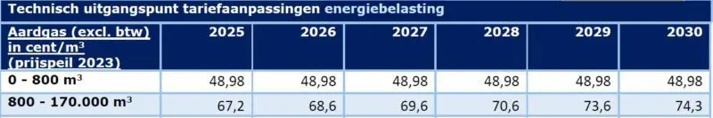Minister Rob Jetten van Energie wil de energiebelasting op gas opknippen in twee schijven. In de eerste schijf, tot 800 kuub, blijft de energiebelasting de komende jaren gelijk, maar vanaf 800 kuub gaat de energiebelasting naar 67 cent (ex btw) in 2025 en loopt op tot 74 cent in 2030.