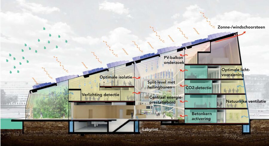 De Energy Academy Europe is een bijzonder gebouw. Het gebouw maakt gebruik van wat in ruime mate voorhanden is: de elementen aarde, water, lucht en zonlicht. Zonnepanelen leveren energie, een ‘zonneschoorsteen’ helpt de natuurlijke ventilatie, de wintertuin en het gebruik van aardwarmte en –koeling zorgen voor een aantrekkelijk binnenklimaat. Het regenwater wordt opgevangen voor toiletspoeling en plantenbewatering. Ook is het gebouw eerste grote nieuwe aardbevingsbestendige gebouw in Groningen. Het project won begin dit jaar al een prestigieuze BREEAM-Award.
