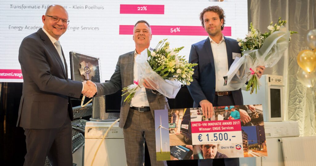 Vorig jaar won ENGIE Services de eerste Uneto-VNI Innovatie Award. Dit deed het met de Energy Academy Europe, een duurzaam gebouw in Groningen. De andere projecten in de finale waren de verbouwing van het Thialf-ijsstadion in Heerenveen (door Warmtebouw Utrecht, Croonwolter&dros (i.s.m. Huussen Elektro, Koninklijke Damstra Installatietechniek) en de transformatie van een F16-shelter op vliegbasis Twente (door Klein Poelhuis).