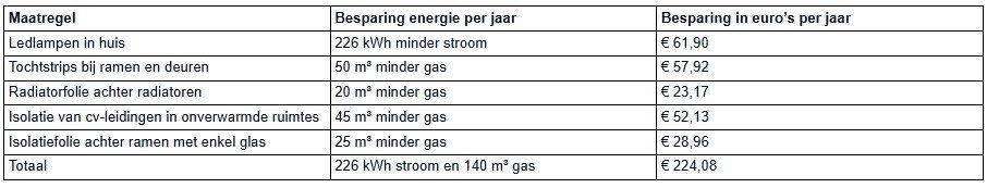 De jaarlijkse besparing bestaat uit 226 kWh minder stroomverbruik en 140 m³ minder gas. Vooral ledlampen drukken het elektriciteitsverbruik, terwijl eenvoudige isolatiemaatregelen warmteverlies beperken.