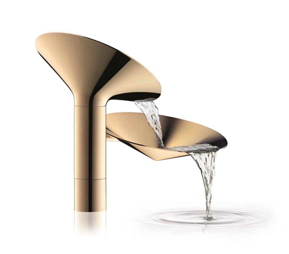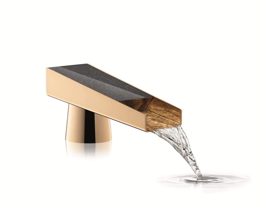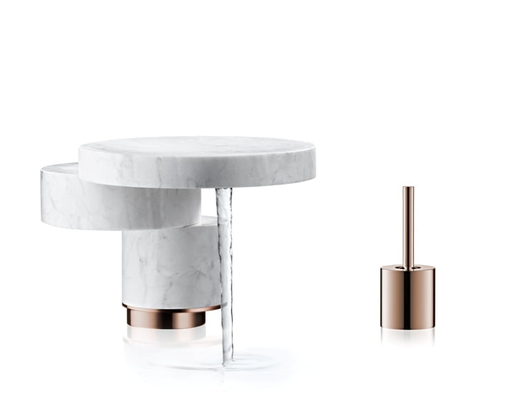 Bij Water Steps stroomt het water van platform naar platform. Deze schaaltjes van metaal, komen uit het brein van het Zweedse designduo FRONT. De nadruk ligt op de speelse interactie tussen water en vorm: niet alleen esthetisch, maar ook akoestisch: je hoort het water stromen over de goudkleurige, metalen oppervlak stroomt. FRONT was al eerder verantwoordelijk voor een conceptkraan voor Axor: deze knipoog naar het installatiemateriaal koper.