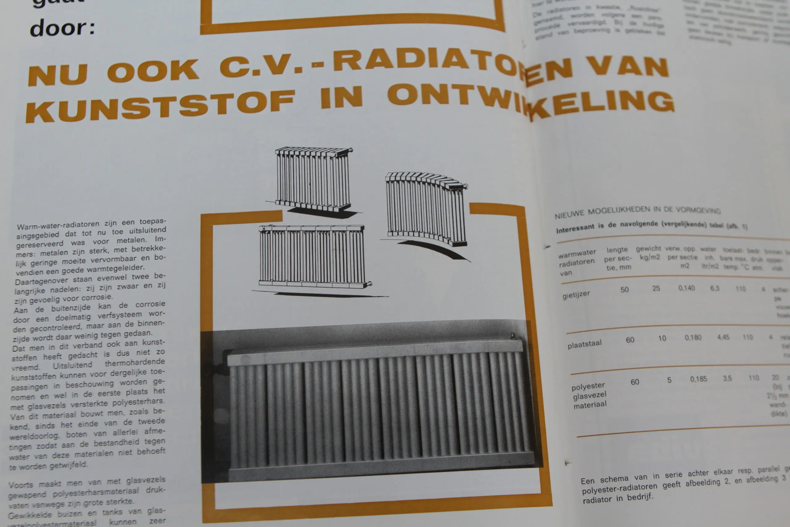 Hebben kunststof radiatoren de toekomst? In 1968 was het in ieder geval een vermeldenswaardige ontwikkeling. Kunststof radiatoren roesten niet en zijn veel lichter dan hun metalen broertjes. Toch zien we deze variant vandaag de dag weinig terug. Deze exemplaren zijn vervaardigd door de firma Kirsch uit Trier.