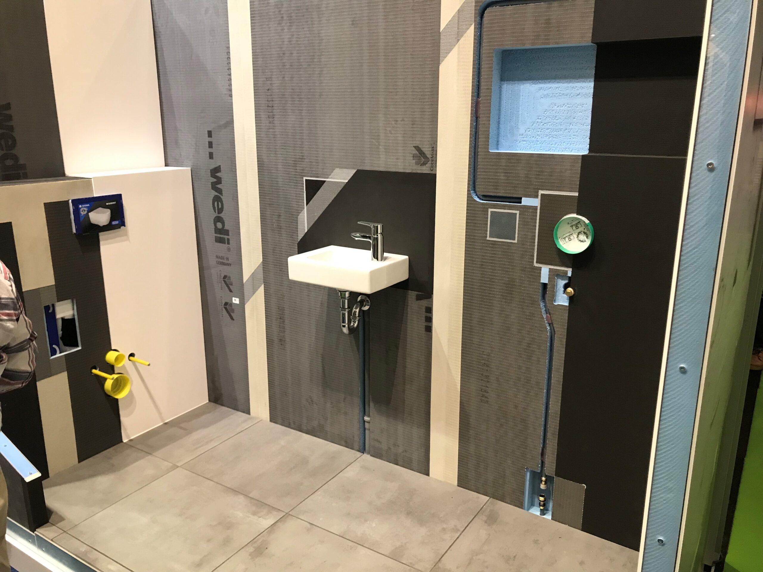 De hardschuimen Wedi-platen kunnen nu ook prefab voorzien worden leidingwerk. Daarmee kunnen nu nog sneller badkamers en sanitaire ruimten worden opgebouwd.