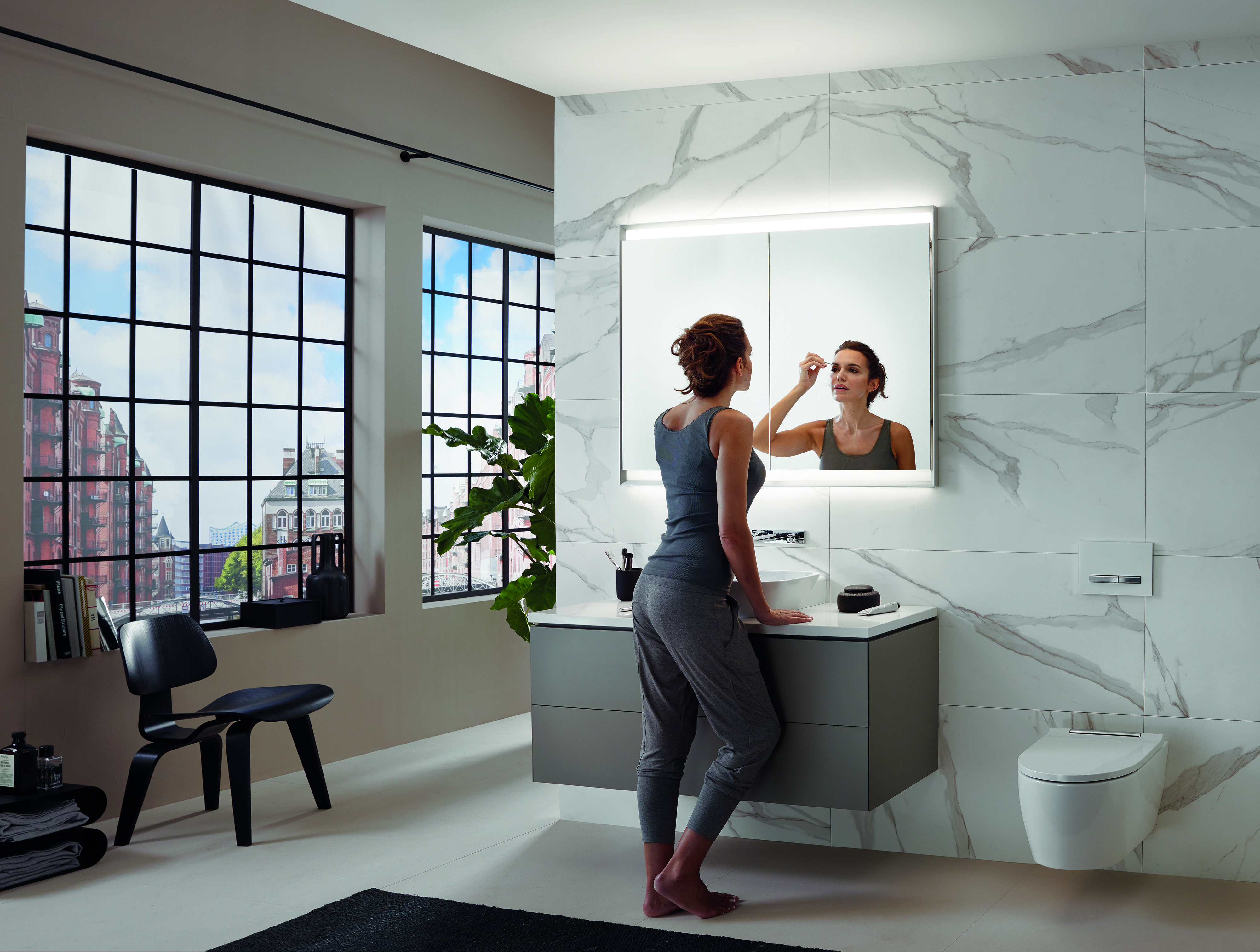 De nieuwe Geberit ONE-spiegelkast met ComfortLight biedt harmonisch afgestemde verlichting voor elke activiteit in de badkamer. Van een helder en verkwikkend licht om de dag goed te beginnen en een warm en rustgevende verlichting om te ontspannen tot een zacht en flatterend licht voor het slapen gaan en een discrete verlichting voor de juiste oriëntatie ‘s nachts. De verlichting is intuïtief en vloeiend bedienbaar en ook in te stellen via de Geberit Home-app.