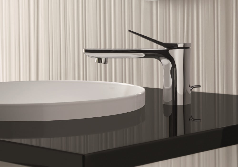 De L-vormige kraan heeft een opvallend design: een geometrische basisvorm met grote vlakken en smalle kanten. De hendel komt ‘vloeiend’ uit de kraanbody. Opvallend is de zwarte laag onder de hendel. De serie bestaat uit een- en tweegreeps kranen in zowel opbouw als inbouw in verschillende groottes, alsmede bad- en douche (meng)kraan-uitvoeringen. In totaal bevat de serie, verkrijgbaar in chroom en platina mat ongeveer 25 uitvoeringen. Deze zomer in in Nederland.
