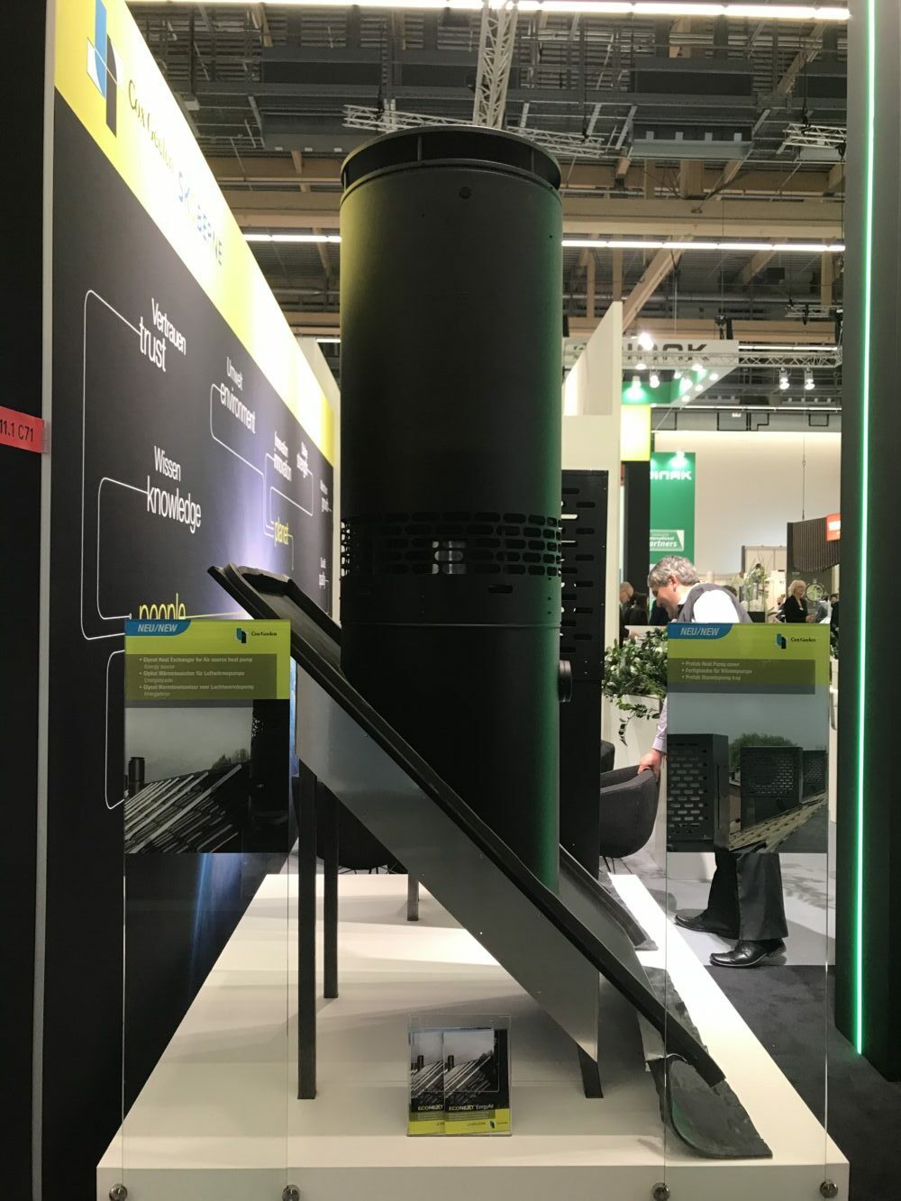 Het lijkt een lijvige schoorsteen, maar is de warmtepompbron. De Econext EnrgyAir die Cox Geelen op de Duitse vakbeurs ISH toont bevat 100 meter slang met glycol. Hiermee wordt een warmtepompinstallatie gevoed.
