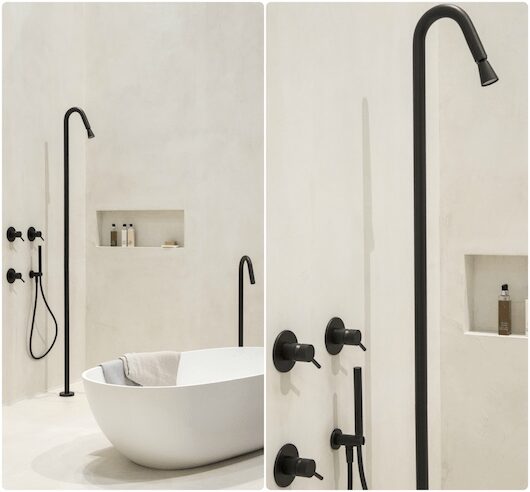 Een opvallende trend in badkamerland: kranen en douches die niet standaard verchroomd zijn, maar voorzien van een kleurtje. Opvallend trendy is matzwart, dat naast mat-chroom en koper/nikkelkleuren veel in de belangstelling staat als kleuralternatief. Op de foto de nieuwe introductie van JEE-O, dat haar slimline-serie nu ook in zwarte finish op de markt brengt. De serie bestaat uit een vrijstaande douche, vrijstaande badvuller, wanddouche, wand- en opbouwkranen, regendouches en wandmengkranen. Maar ook grote designmerken als Axor, Dornbracht en Vola, timmeren aan de weg met kleurvarianten op traditioneel verchroomd.