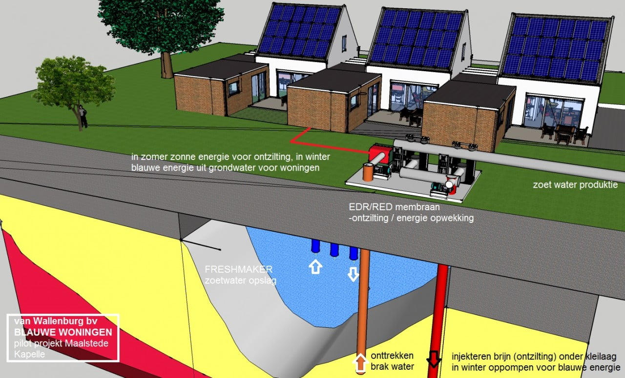 Naast de daken van de huizen en appartementen wordt ook een eventuele geluidswal voorzien van pv-panelen. Dit zou volgens de berekeningen moeten zorgen voor een overschot van 400 megawattuur. Op deze overgebleven energie kan de ontziltingsinstallatie blijven draaien.