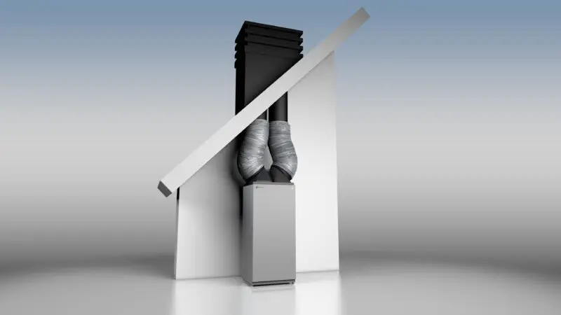 Paros met ‘schoorsteen’ van Breman Installatiefabriek. Afzonderlijk maakt het systeem gebruik van aan en afvoerkapjes van Ubbink.