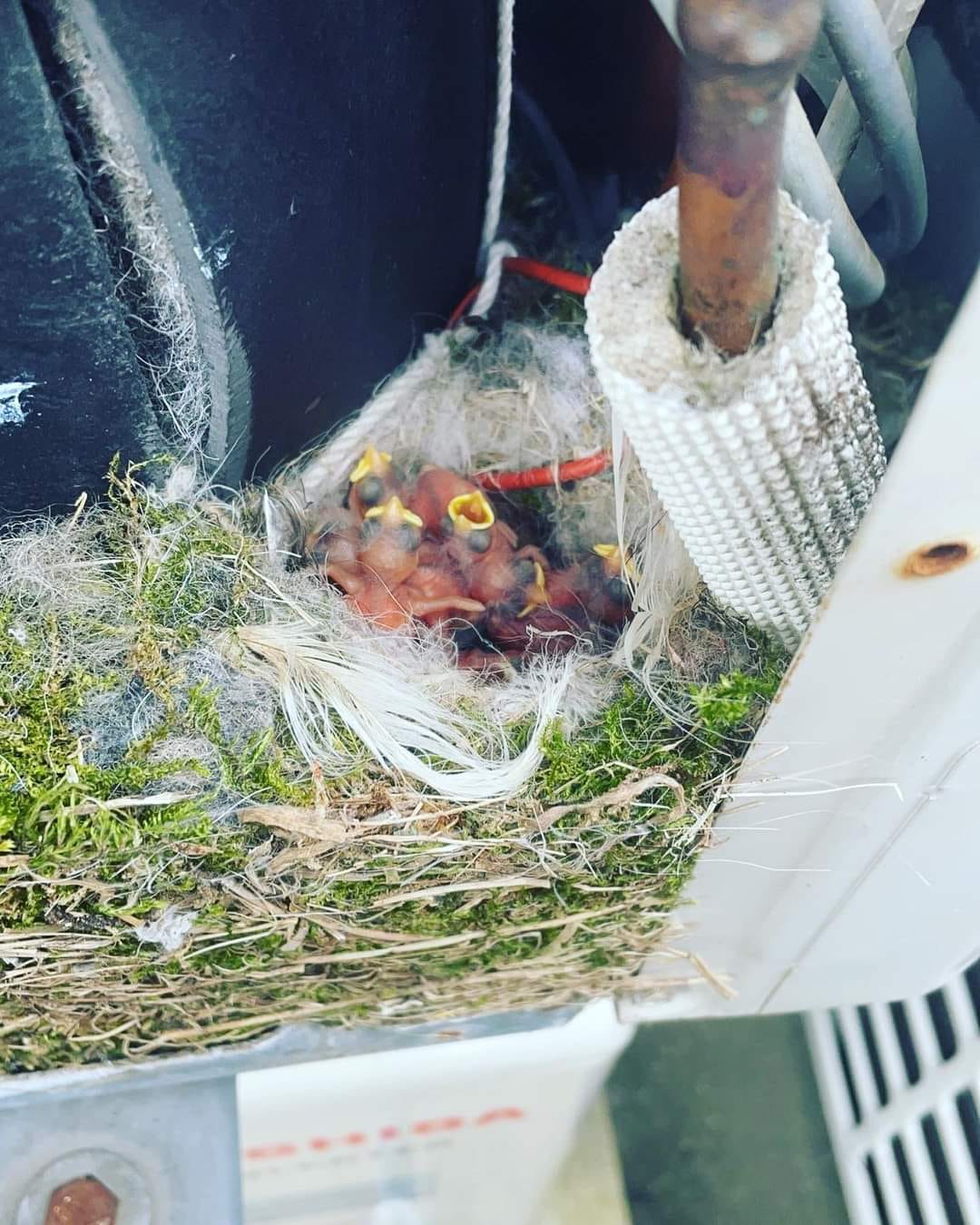 Deze vogel had ervoor gekozen om in de beschutting van de koelinstallatie in alle rust een mooi nestje te bouwen. Toen de kap eraf ging, dacht de kroost dat er eten werd bezorgd. In overleg met de opdrachtgever is ervoor gekozen om de vervanging van de airco even uit te stellen totdat dit nest is uitgevlogen. In ieder geval zal de airco dan niet meer piepen.