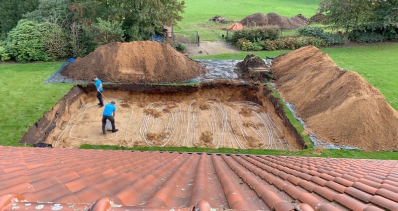 het ingegraven vertikale matje is dan beter ( en bestaat uit een 20cm brede 2 mtr diepe sleuf onder de tegels) , ik ben ook bezig om te kijken of we betaalbaar met grondankers meerdere boringen op 5 tot 10mtr diepte kunnen maken , vanaf 3 mtr blijft de grond temperatuur redelijk constant , en dus wat je er zomers instopt kun je er s’winters ook weer uithalen. het systeem moet nog beter kloppen