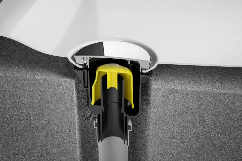 Toch is de benodigde ruimte voor de afvoer onder de douchebak verder gereduceerd. Door de centrische positie van de afvoeraansluiting is de inbouwhoogte niet meer hoger dan de hoogte van de douchebak. De totale inbouwhoogte van de afvoereenheid bedraagt slechts 137 mm inclusief de buisaansluiting.