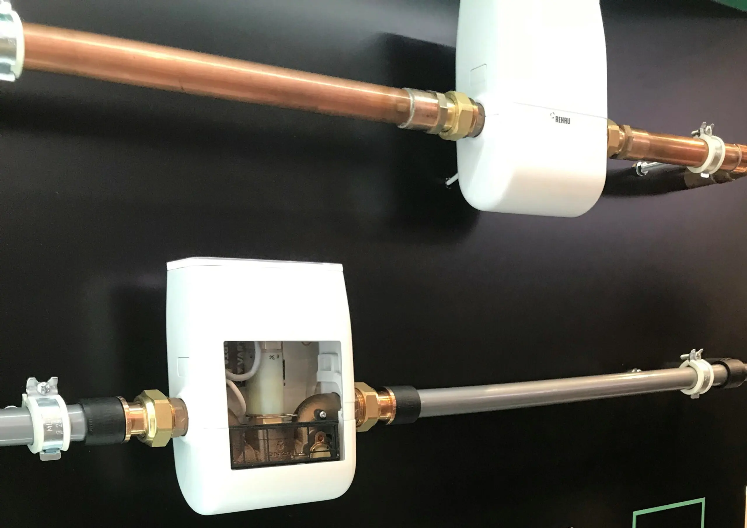 Een regelaar die de waterleiding sluit bij lekkage of drukverlies. Rehau introduceert dit jaar de Re.Guard, een kastje dat achter de watermeter geplaatst kan worden, en verbonden is met de smartphone van de woningeigenaar.