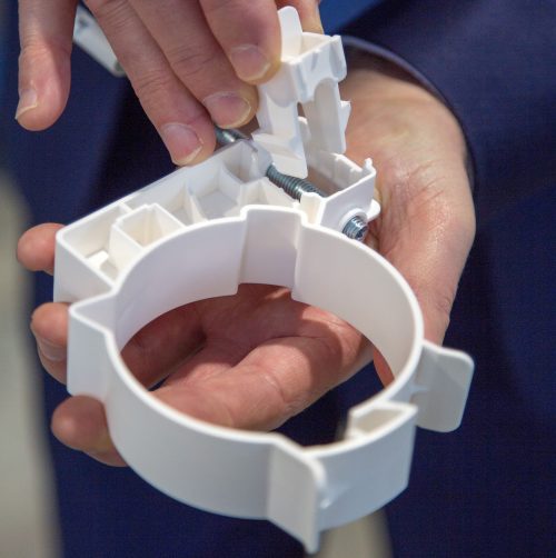 Burgerhout komt met een nieuwe beugel voor haar parallelle Safe-PP rookgasafvoersysteem. Net als bij de kunststof beugel van collega-leverancier Ubbink moet deze zijwaarts worden gefixeerd. Burgerhout maakt gebruik van een slimme borgclip om de beugel ‘foolproof’ te bevestigen.