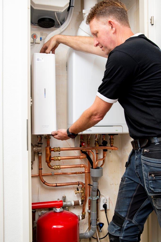 Bij de installatie van de Xtend wordt ook de cv-ketel vervangen, alsmede uiteraard de daarbij behorende rookgasafvoer, maar ook de woonhuisventilator. Die zit namelijk in dezelfde kast en is praktisch alleen bereikbaar nadat de ketel verwijderd is.
