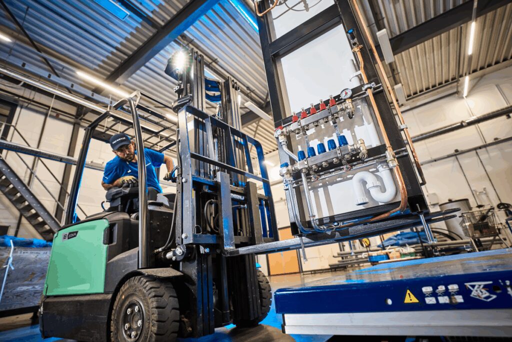 Want – derde voordeel – de snelheid in het project in Naarden is enorm. De installatie ter plekke maken? Dat zou met alle buizen, leidingen en fittingen, verdieping voor verdieping, veel tijd kosten. “En niemand vindt dat gesjouw naar boven met z’n spullen leuk.”