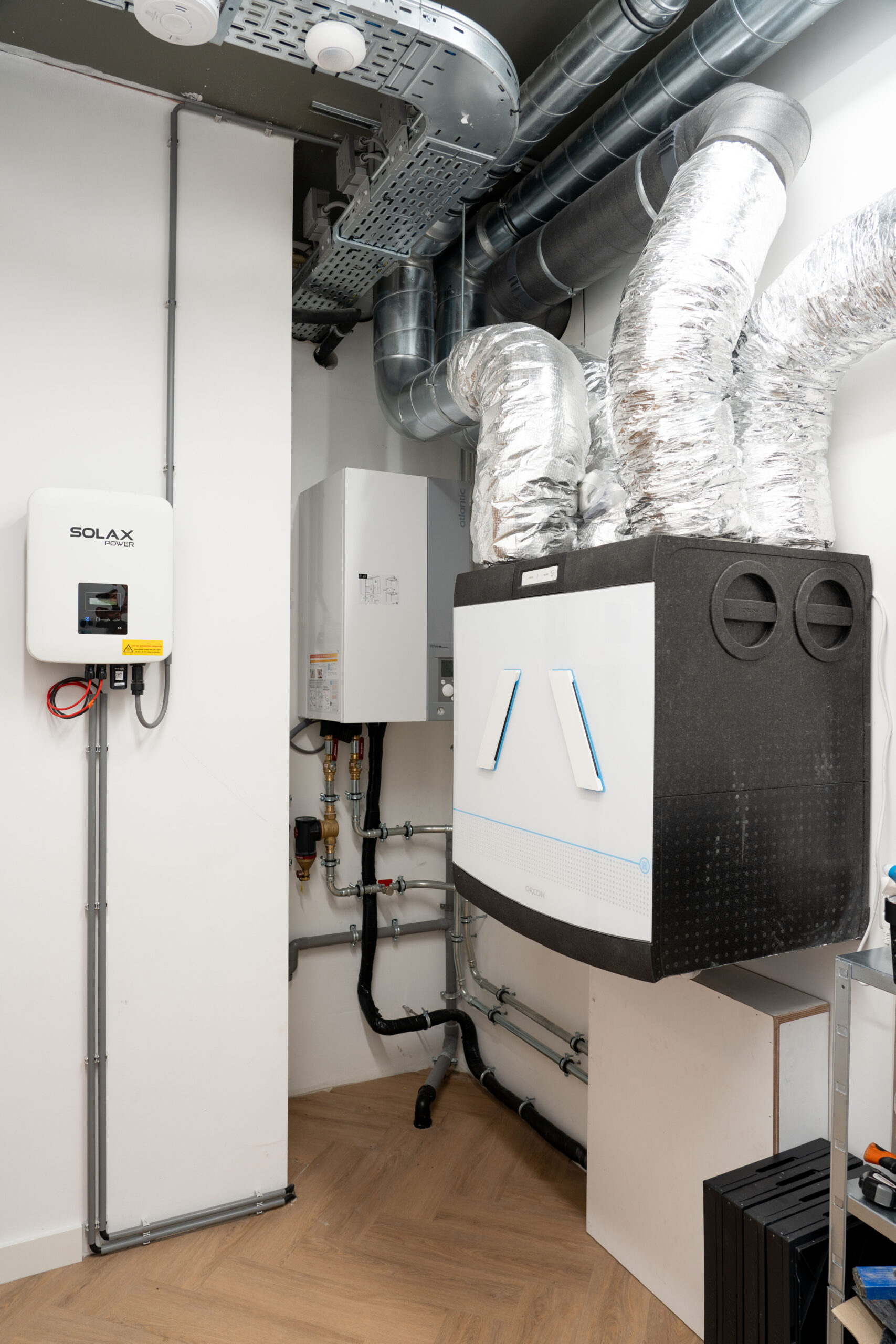 Het nieuwbouwcomplex ’t Lofthuys bestaat uit een kantoor op de begane grond met daarboven vier loftappartementen en is direct aan het spoor gelegen. “Dat brengt uitdagingen met zich mee qua geluidshinder. De gemeente eiste dat de ramen aan de kant van het spoor niet geopend kunnen worden.” Het bouwbesluit stelt echter dat een woning moet voldoen aan de spuivoorziening: ramen, luiken of deuren moeten dermate tegen elkaar open gezet kunnen worden, dat er voldoende luchtstroming ontstaat. Om dit ventilatievraagstuk te tackelen, werd de hulp van Van Niel ingeschakeld. Hij adviseerde de HRC EcoMax van Orcon, een balansventilatiesysteem met warmteterugwinning. Uitgerust met CO₂-sensoren, voert het de lucht mechanisch af uit de woningen. De warmte van die afgevoerde lucht kan tot wel 99,7% worden teruggewonnen en wordt weer afgegeven aan de mechanische luchttoevoer van de woning. Het vraaggestuurde ventilatiesysteem voldoet daarmee ruimschoots aan de BENG-eisen.