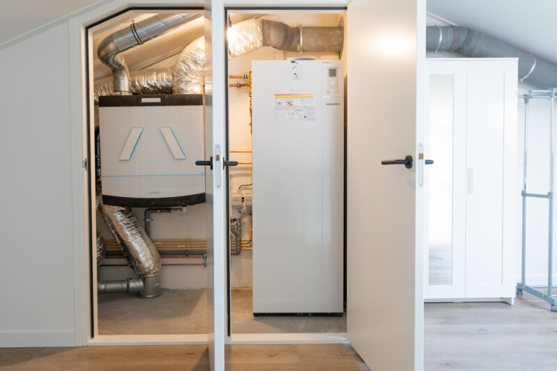 Groupe Atlantic is een wereldwijde speler op het gebied van thermische oplossingen, waar de producten van de merken Orcon, Atlantic en Fujitsu onder vallen. Daarmee biedt het bedrijf geïntegreerde totaaloplossingen voor het binnenklimaat. Van Niel: “Ik plaats de ventilatiesystemen van Orcon al langer naar volle tevredenheid. De lijnen zijn kort, dus ik kan er altijd terecht voor advies. Zo ook bij dit project.” ’t Lofthuys is ontworpen om ‘nagenoeg energieneutraal’ te zijn, met een energielabel A+++. In het bestek werd bepaald dat er in de warmtevraag zou worden voorzien door een warmtepomp. “Toen dat zo ter sprake kwam in het gesprek met Groupe Atlantic, gaven ze aan dat ze ook warmtepompen kunnen leveren. Ik was hiervoor nog helemaal niet bekend met de warmtepompen van Atlantic, maar het idee om alles onder hetzelfde label te kunnen leveren, sprak mij enorm aan. Ik vind dat ook netjes richting de eindgebruiker.” Dus werd er naast de WTW-unit van Orcon ook een Atlantic Alfea Extensa A.I. R32 lucht/water warmtepomp geplaatst, in de wandelgangen van Groupe Atlantic ook wel het koningskoppel genoemd. De split unit warmtepomp garandeert met zijn coaxiale warmtewisselaar en geïntegreerd buffervat van 16 liter een constant en comfortabel binnenklimaat.